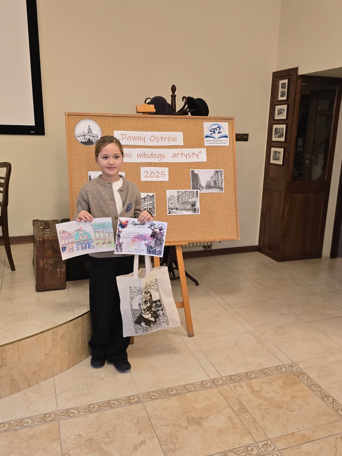 20 listopada 2025 r. w Muzeum Miasta odbył się Międzyszkolny Konkurs Plastyczny klas 3 pt.: ,,Dawny Ostrów oczami młodego artysty”, którego organizatorem jest SP nr 2, we współpracy z Muzeum Miasta Ostrowa. Zadaniem uczestników było wykonanie kredkami akwarelowymi pracy plastycznej przedstawiającej fragment dawnego Ostrowa – kamienice, witryny sklepowe lub dawne ekspozycje ukazane w muzeum. Każdy uczestnik wylosował temat – witrynę, która była inspiracją do pracy. Jury wytypowało 2 laureatów oraz 3 wyróżnionych. Naszą szkołę reprezentowała Liwia Chmielewska z kl. 3 a, która została jedną z laureatek. Gratulujemy i życzymy dalszych sukcesów.